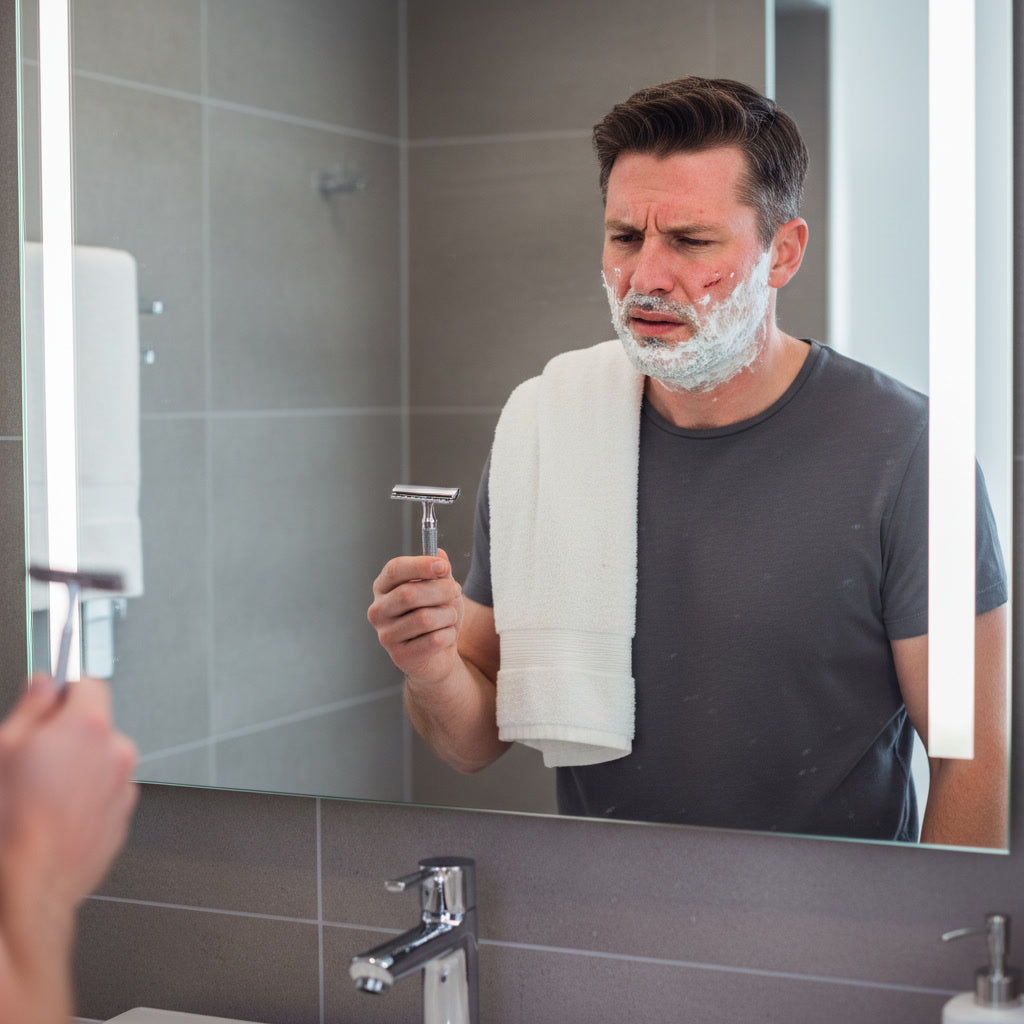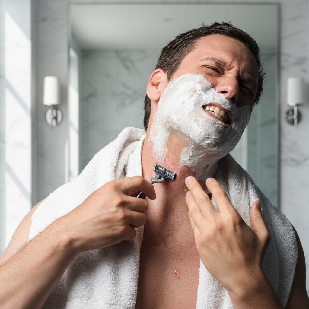 - Rasage inégal : zones ratées, poils incarnés, tiraillements.