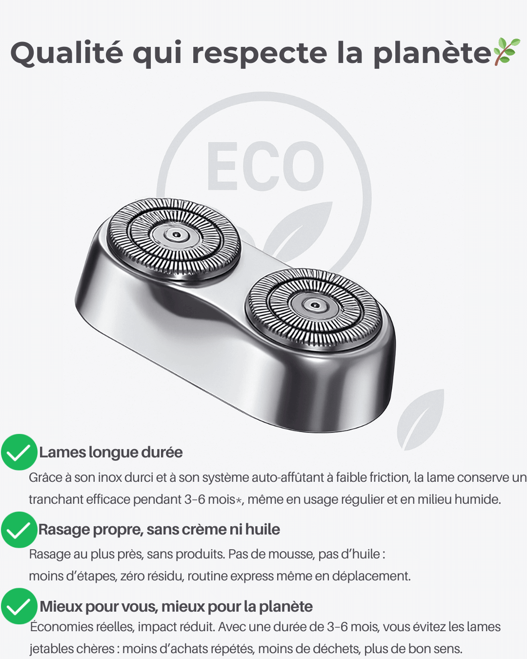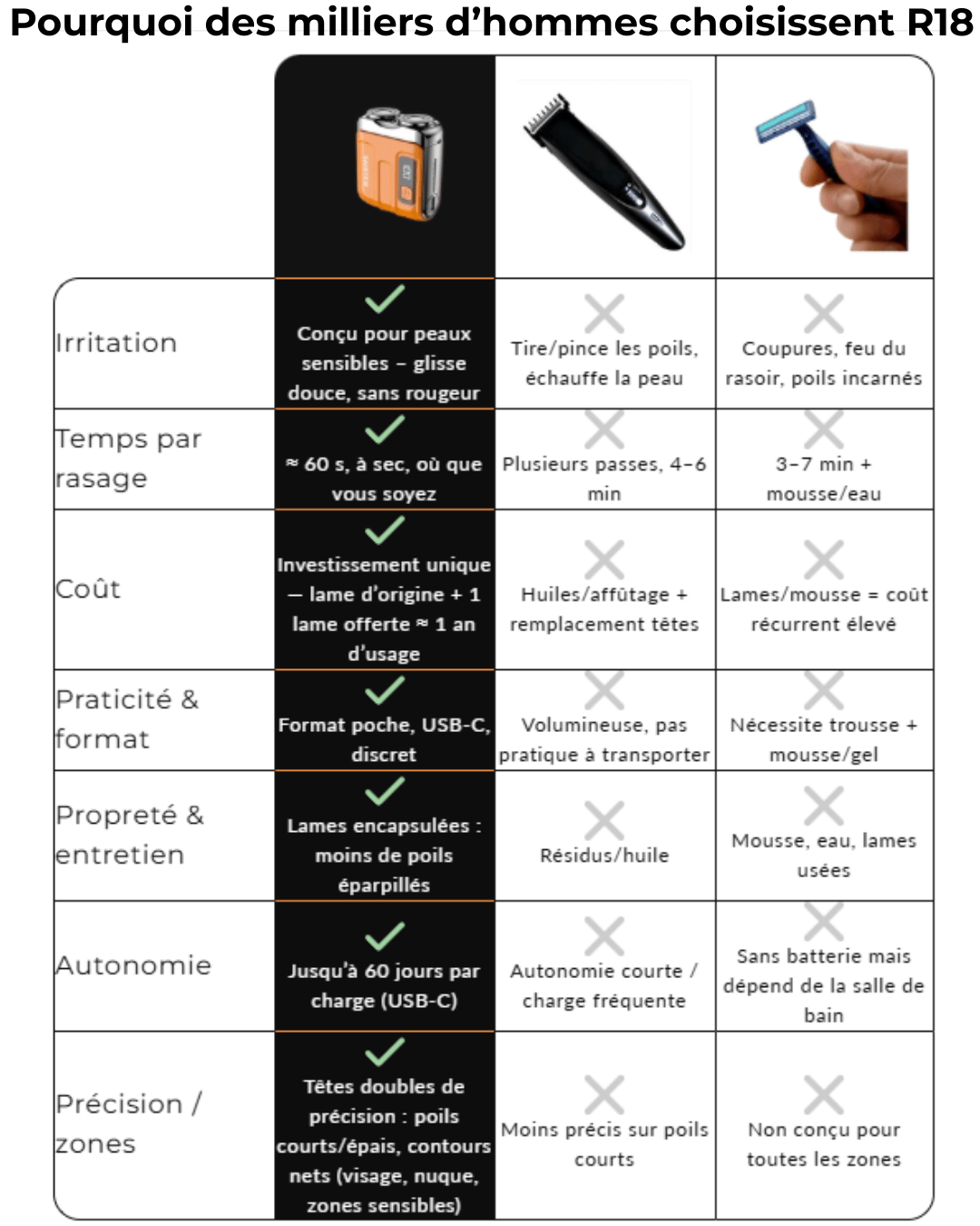 ✓ Tu bouges souvent (travail, voyages) et tu veux un rasoir compact, discret, toujours prêt